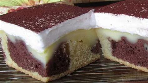 Recept na vynikajúci šťavnatý pudingový koláč so smotanou. Jednoduchá príprava, nadýchané cesto a krémová plnka.
